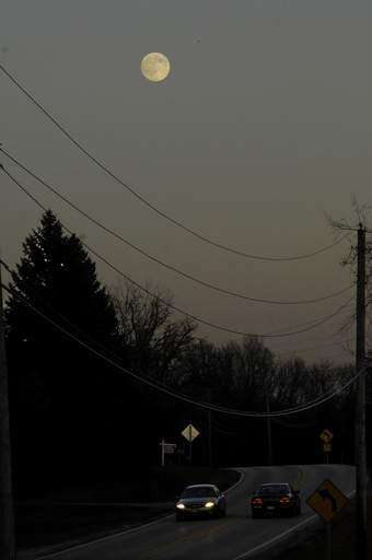 Cars travel under a full moon on Route 31 in South Elgin early Sunday evening, as the time change now darkens the skies earlier.