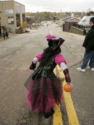 Sindney Premer, 10, of Batavia dons a costume to roll her pumpkin down Houston Street in downtown Batavia during the BatFest Pumpkin Roll Saturday afternoon.