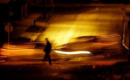 A pedestrian and traffic go west on a damp Main Street and cross 3rd Avenue in St. Charles Monday evening.