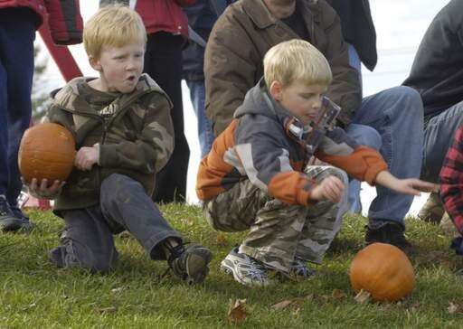Friends Ethan Byne, 6, and Morgan Brunk, 6, both of Mundelein, roll pumpkins down the sled hill during the Mundelein Park and Recreation District's Pumpkin Drop Sunday at the Mundelein Community Center.