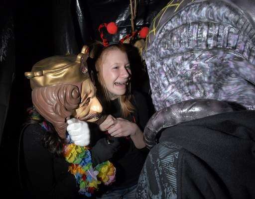 Sophomores Vidhi Thakkar and Emma Williams get a little bit of Halloween scared into them by an alien at the Palatine High School's annual trick or treat festival.