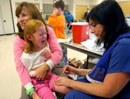 Marybeth Bank of Grayslake holds her daughter Hannah, 4 as Lake County Health Department RN Angela Waldron administers a dose of the H1N1 Vaccine Thursday morning at the Round Lake Area Park District Sports Center.