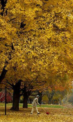Dee Anderson of St. Charles shovels leaves down her driveway as others continue to fall Thursday. "I've got a lot here," she said, "And look how many more are still on that tree."