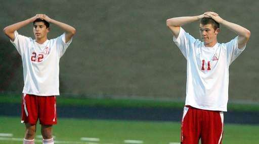 Palatine's Martin Rodriguez, left, and Josh Feldman looked stunned after their 1-0 loss to the Lake Forest Scouts during sectional soccer action Wednesday night at Stevenson High School in Lincolnshire.