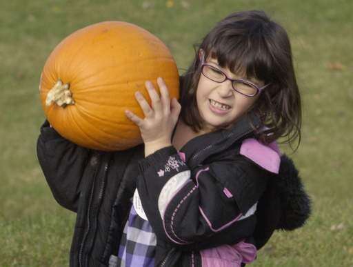 Alison Cohn, 6, of Mundelein, carries a pumpkin to roll down the sled hill during the Mundelein Park and Recreation District's Pumpkin Drop, held Sunday at the Mundelein Community Center.