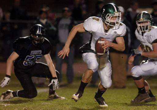 PLAYOFFS-ROUND 2: Elk Grove quarterback Nick Meyer escapes St. Charles North pressure to scramble for a gain during Friday's second round playoff action in St. Charles.