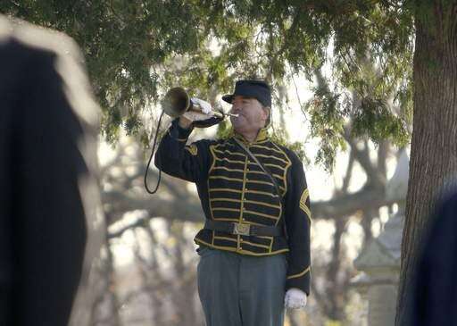 R. J. Samp, of Wheaton, is plays the bugle horn for the 8th Illinois Cavalry Civil War re-enactment regiment during their Veterans Day memorial service in Batavia on Saturday morning.