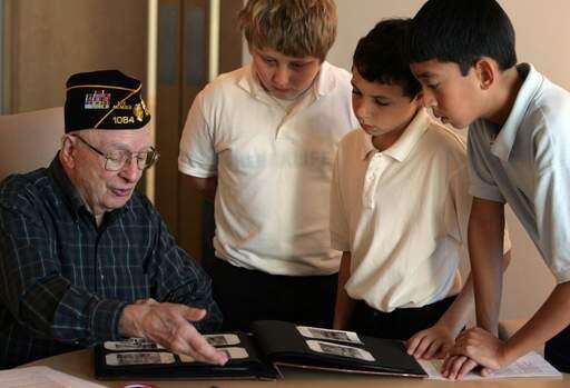 Vietnam and Korean War veteran Richard Johnson talks about his experiences during an interview by St. Hubert's sixth graders Robert Zalenas, left to right, Christopher Broccolino, and Christian Forte as they look at a war photography album.