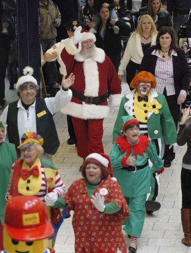 Surrounded by elves and clowns, Santa Claus marches through Woodfield Mall Friday in Schaumburg.