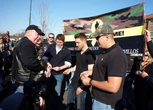 Marines Greg Russell, of Naperville, Nick Milbourn, of St Charles and Phil Akins, of St Charles receive medals during a surprise welcome home party in St. Charles.