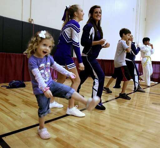 Three-year-old Allie Lekai practices a kick with Tiger Martial Arts during a demonstration at Lake Barrington's Family Fun and Fitness Fair Sunday at the Field House.