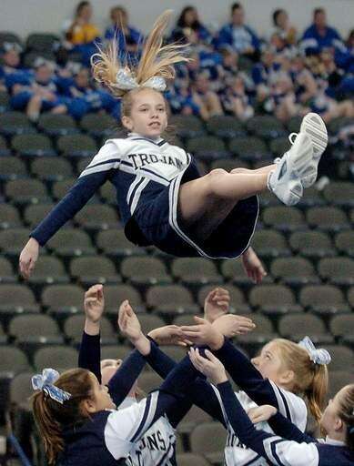 Jenna Schneider of the Cary Jr. Trojans gets tossed around by her teammates during The Spirit Spectacular youth cheerleading event at the Sears Centre.