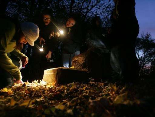 Sixteen-year-old Alex Daniels, left, and the Jacobs' Paranormal Club explore the Algonquin Cemetery Friday on their first ghost hunting trip. The club which is in its first year of existence has about 19 members and meets once a week.