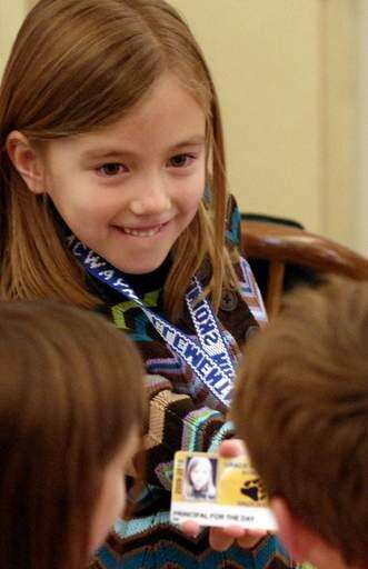 First grader Ella Dorman shows off her "principal for a day" ID to classmates at Grace McWayne Elementary School in Batavia Wednesday.