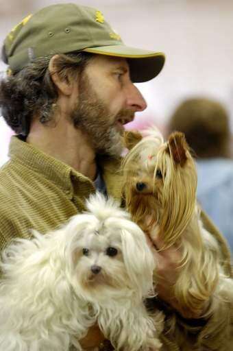 Gerry Heinz of Hinckley holds Bea, an 11-year-old Maltese Terrier, and Dani, an eight-year-old Yorkshire terrier, right, during the Fox Valley Dog Training Club's 58th annual Obedience Trial at the Kane County Fairgrounds Sunday.