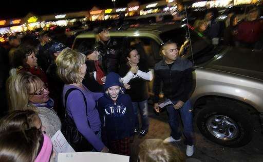 More than 50 people cheered and waved U.S. and Marine Corps flags when he arrived at the Foxboro Plaza shopping center at Route 64 and Dunham Road around 6 p.m.