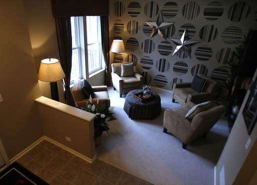 This end unit model home features autumn colors and a contemporary interior with dark woods and lots of artwork.