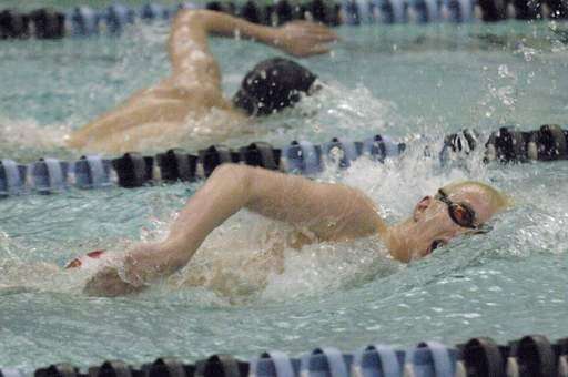 St. Charles North's Chris Dieter, top, and St. Charles East's TJ Bindseil are in a dead heat in the varsity 200-yard freestyle Tuesday.
