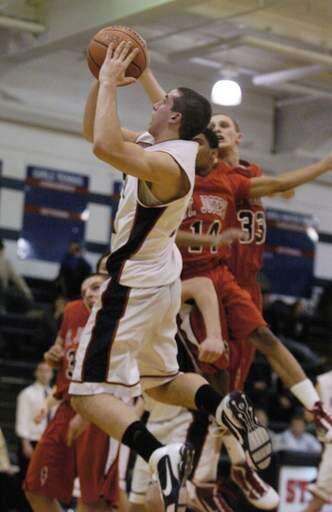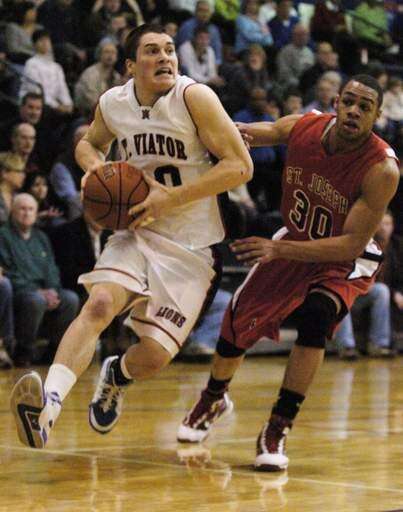 St. Joseph's Joe Edwards, left, and St. Viator's Brendan King hit the floor for a loose ball during Wednesday's game at St. Viator.