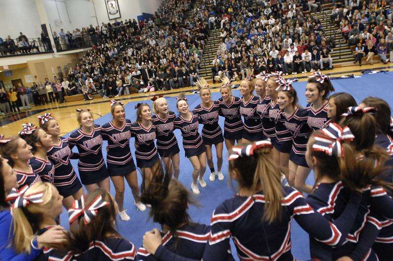 The IHSA State champion cheerleaders Conant Cougars cheer at a rally for students and parents Monday afternoon in the gym. Bill Zars | Staff Photographer