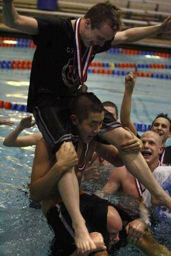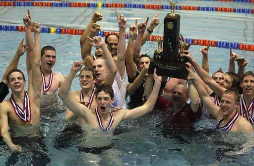 Naperville Central with the first place trophy after winning the boys state swimming championships at Evanston on Saturday February 27.