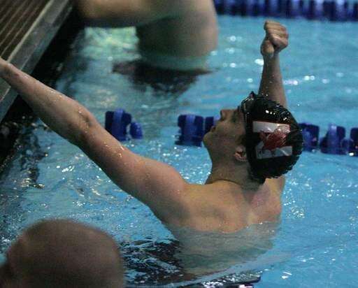 Neuqua Valley's Grant Betulius celebrates winning the 100-yard backstroke at the boys state swimming championships at Evanston on Saturday February 27.