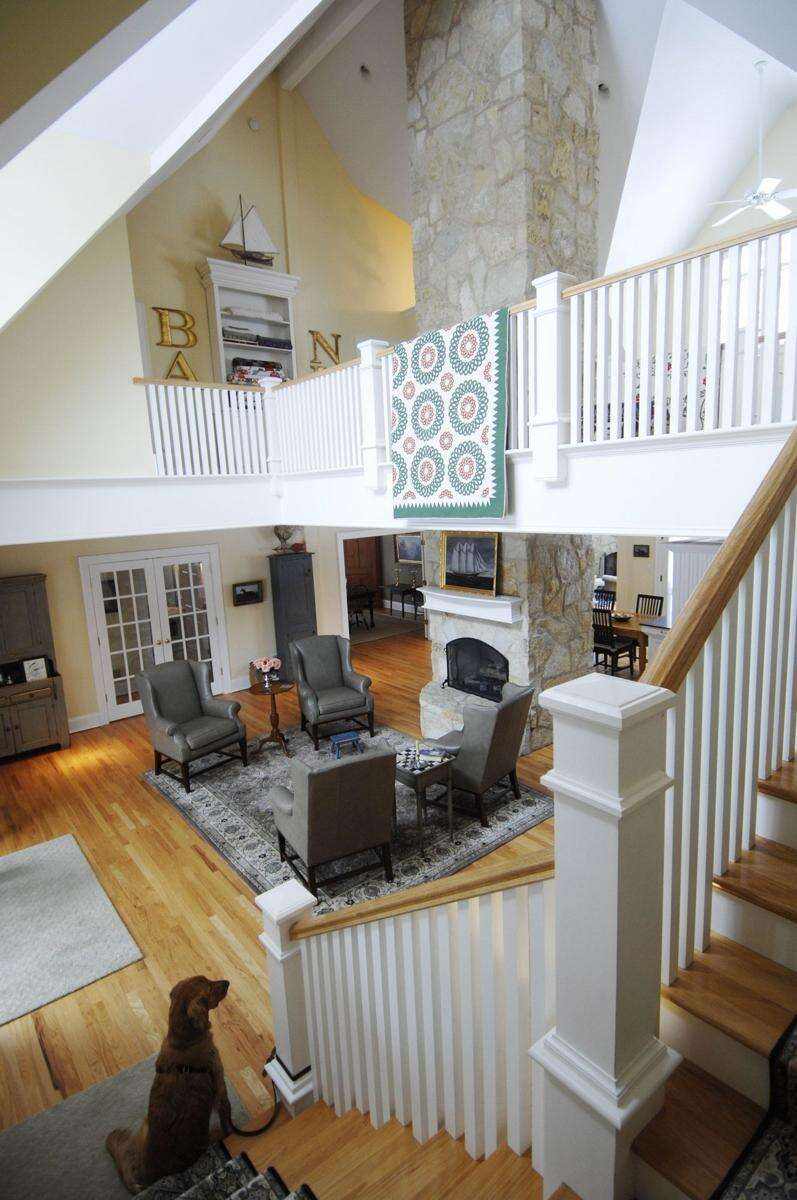 The large kitchen, which shares the fireplace and is visible behind the gathering room, is full of surprises. Industrial-looking tin lights craning gracefully from high above bring sunflowers to mind. White cabinets present the popular unstructured look - including at least one way up on the second-floor level in the two-story room. A secret: It opens from the back in the master bathroom, so no scaffolding is required to arrange a display.