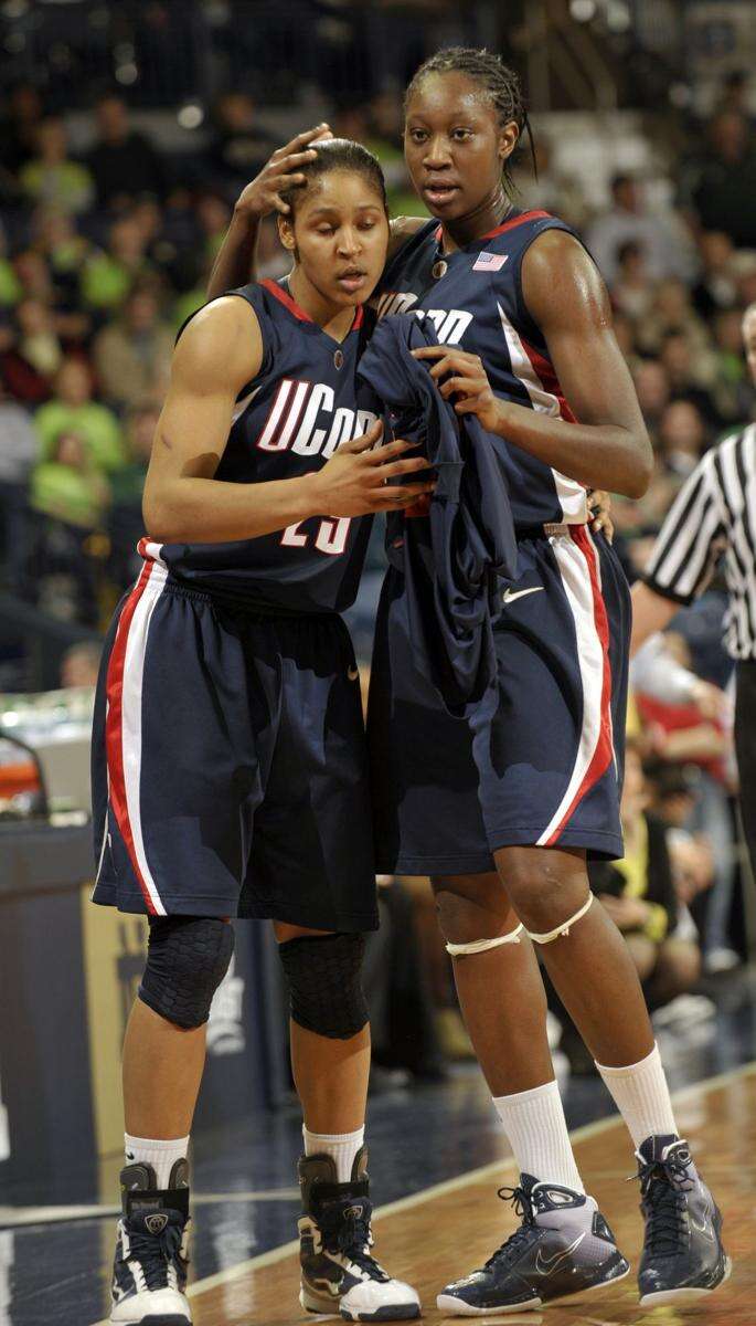 Connecticut center Tina Charles, right, pats her teammate forward Maya Moore on the head as they leave the court late in the second half of an NCAA college basketball game with Notre Dame Monday March 1. Associated Press