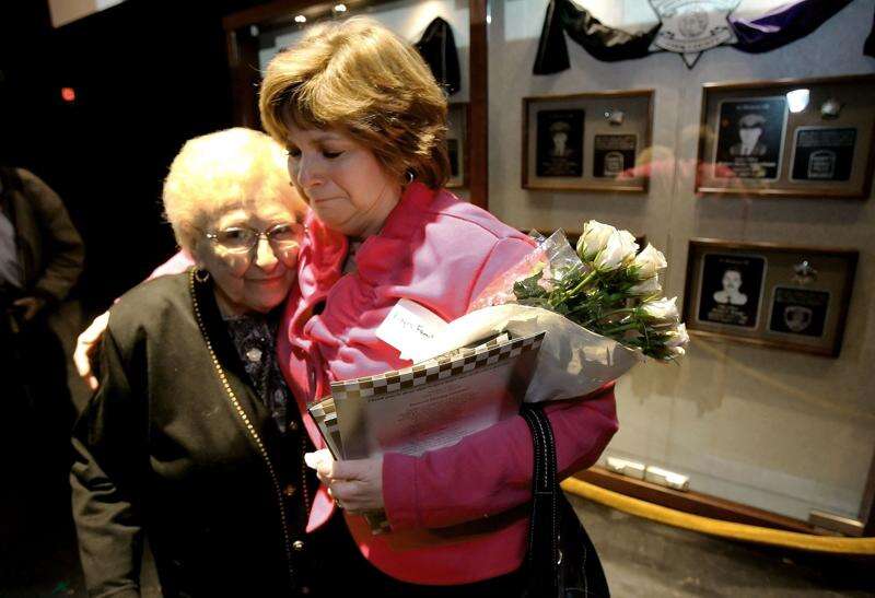 Relatives of the officers hugged as Chief Holbrook gave the final roll call, which concluded with the distribution of folded flags and stars to family members. Present for the ceremony was a 4-year-old Belgian Malinois named Ridges, a member of the sheriff's K-9 unit who was named for Michael Ridges.
