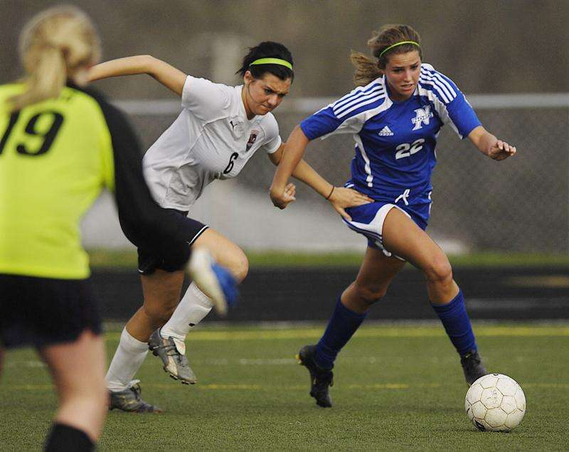 South Elgin's Dana McElwain keeps a hand on St. Charles North's Leah DeMoss as she charges goalkeeper Emily Young Tuesday in Streamwood. John Starks | Staff Photographer
