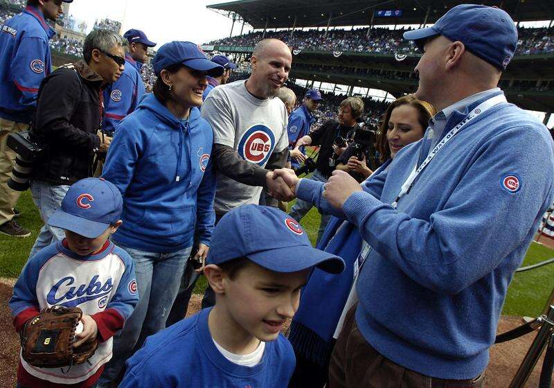 The Sluga family - Keith,Tammy, Wade and Trey - meet the Ricketts family after throwing out the first pitch on Opening Day at Wrigley Field. Mark Welsh/mwelsh@dailyherald.com