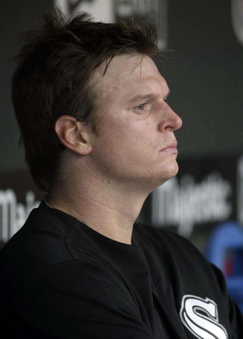 Chicago White Sox starting pitcher Gavin Floyd sits in the dugout after leaving the game in the second inning. Floyd pitched one inning and gave up six hits and seven runs. Associated Press