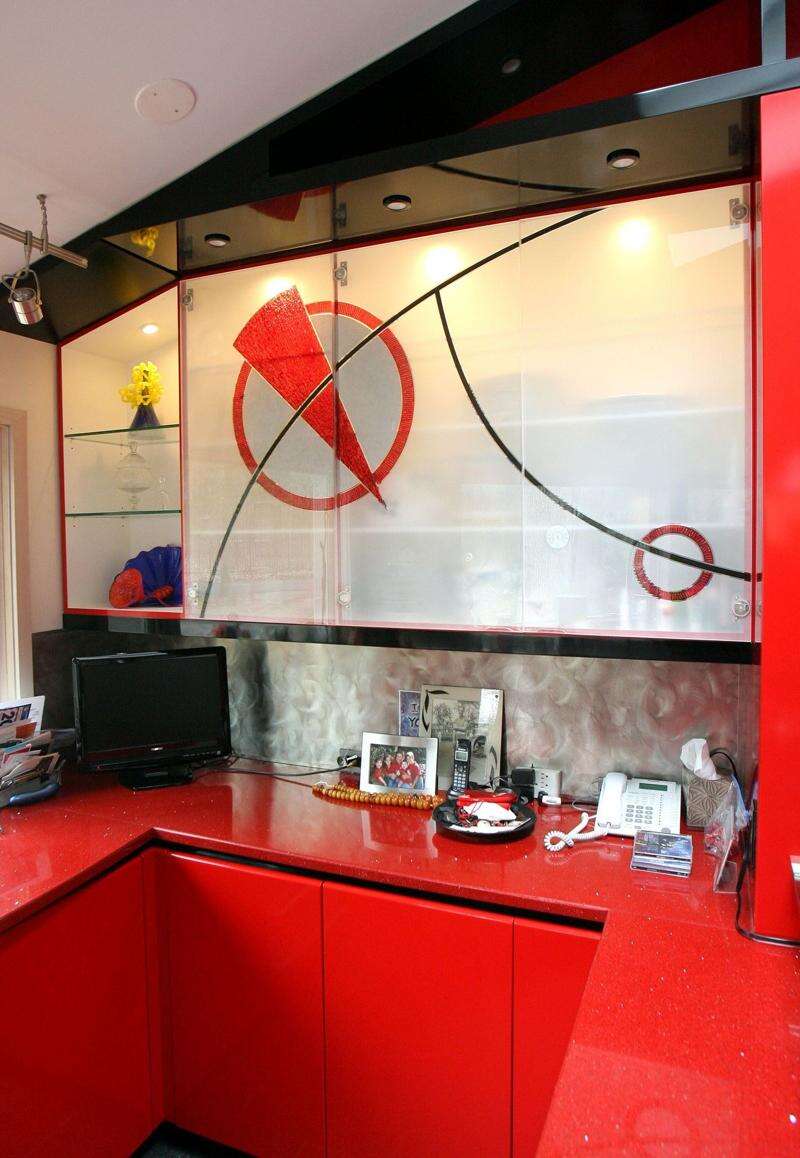A kitchen cabinet door was hand chiseled to create a graphic inspired by the homeowner's design for the glass countertop. Pease notes there are things you can do with acrylic that you can't with the heavier glass.