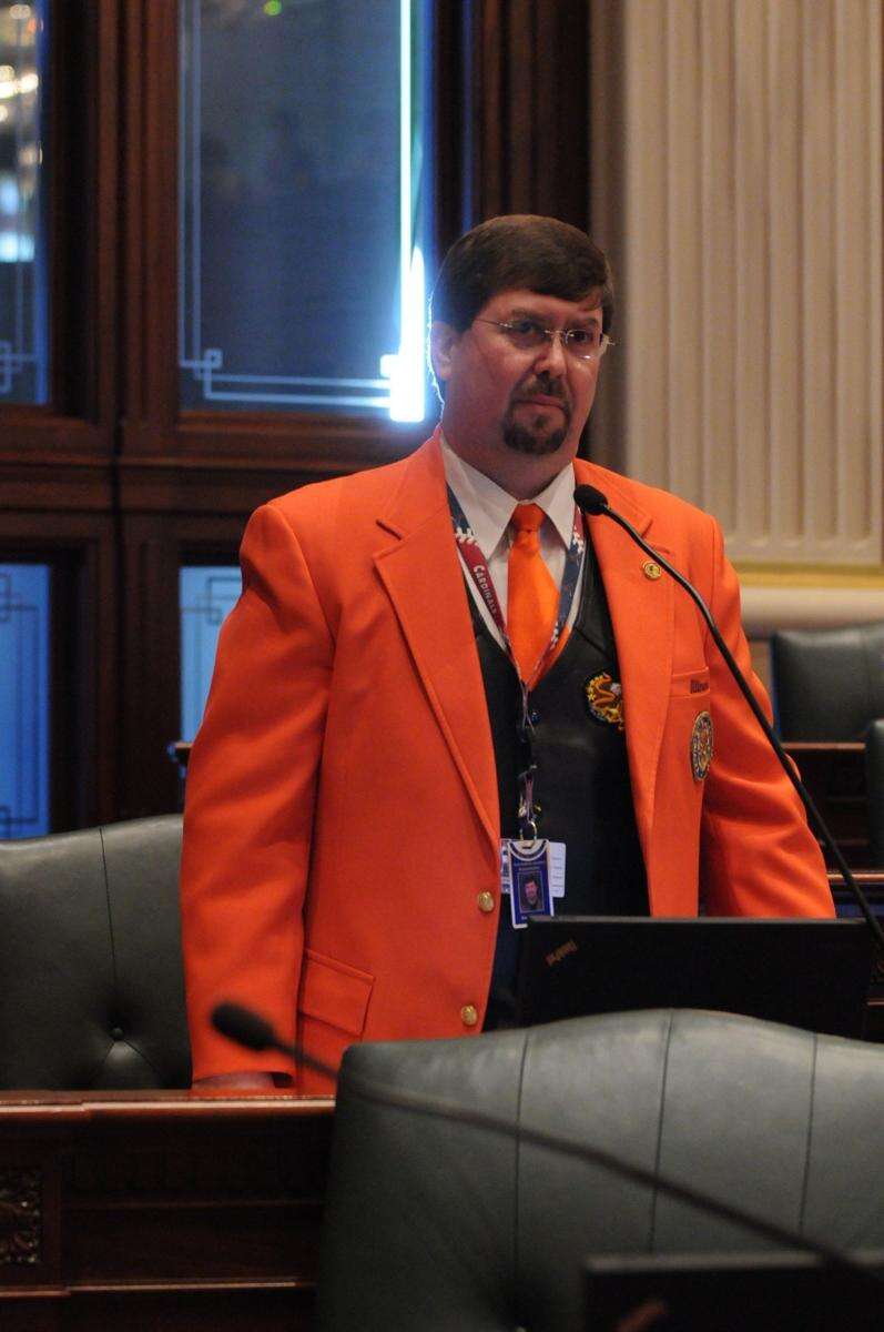 It all began a few years ago in advance of the Illini playing Michigan in basketball. For that day's House session, Ramey donned an orange blazer that looked like something only Henson or Bruce Weber could justify wearing in public. The jacket is actually one worn for the 1988 Republican National Convention. All Illinois delegates received the bright jackets to wear to the nomination sessions.