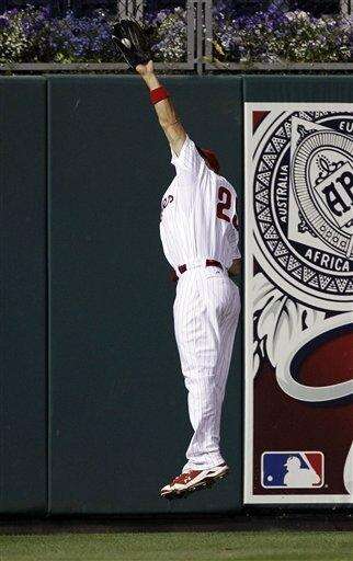 Phillies left fielder Raul Ibanez leaps to catch a deep fly out by Chicago Cubs' Derrek Lee in the sixth. Associated Press