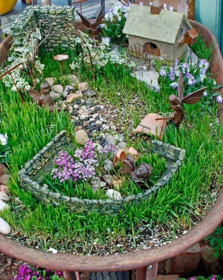 Before you build your fairy garden, decide what kind you want to have. A woodland fairy garden consists of natural items like mushrooms, moss, acorns and a door on the trunk of a tree or a stump. Include miniature metal garden tools and a bench. This style is perfect for a shady area.