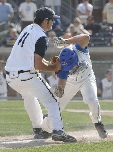 Westminster Christian catcher Frank Oliver gives Marquette's Drew Gerding an out at home plate in the second inning of super-sectional game held at Benedictine University on Tuesday, June 1.