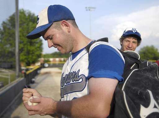 Westminster Christian's Kevin Elder autographs a ball for two children after the Warriors super-sectional win on Tuesday, June 1.
