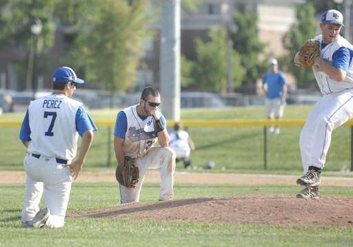 Westminster Christian's Ryan Perez and Joe McGannon appear to kneel and say a prayer as pitcher Kevin Elder takes the mound in the fifth inning of super-sectional game on Tuesday, June 1.