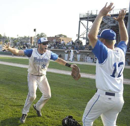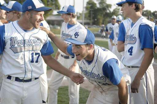 Westminster Christian's Joe McGannon celebrates with a coach after their win over Marquette in super sectional game on Tuesday, June 1.