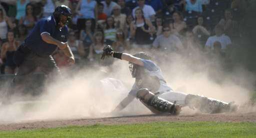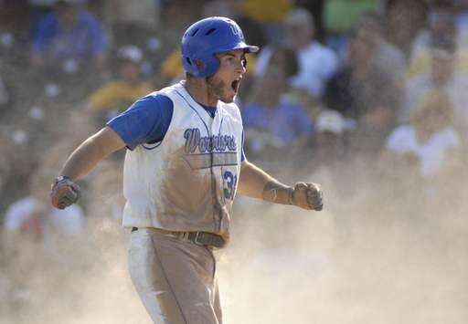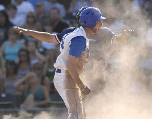 Westminster Christian's Joe McGannon is pumped after sliding safely into home plate, giving the Warriors a 2-0 lead over Marquette in the third inning of super-sectional game on Tuesday, June 1.