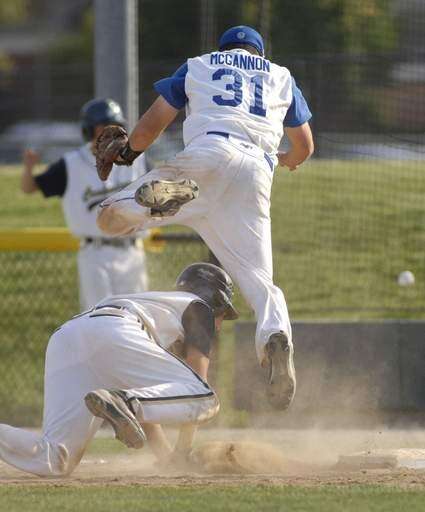 Westminster Christian's Joe McGannon leaps out of the way as the ball flies past first, hits the wall and pops up as Curtis Johnson slides safely back to first base in the sixth inning of super-sectional game on Tuesday, June 1.