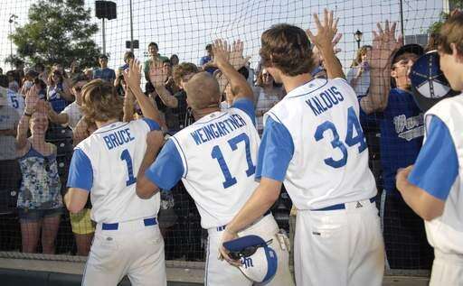 Westminster Christian's Mike Bruce, Brandon Weingartner and Jordan Kalous give fans high-gives through the netting after their win over Marquette in super sectional game on Tuesday, June 1.