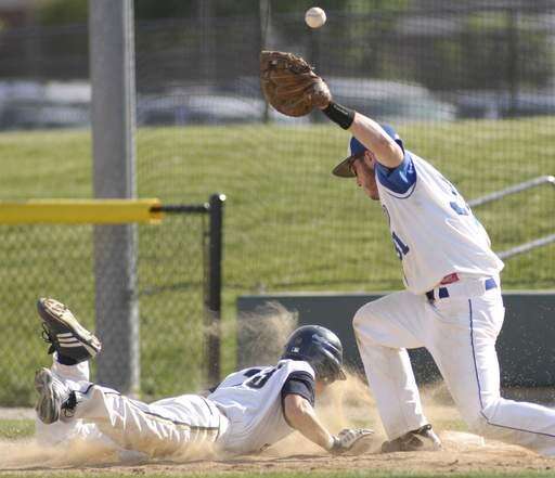 Marquette's Zak Worsley is safe on first from Westminster Christian's Joe McGannon as the ball pops up in the third inning of super-sectional game held at Benedictine University on Tuesday, June 1.