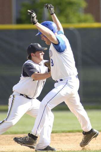 Westminster Christian's Brandon Weingartner is tagged out between second and third by Joe Ceja in the first inning of super-sectional game on Tuesday, June 1.