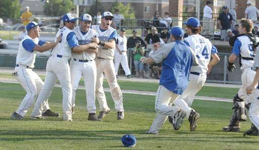 Westminster Christian pitcher Kevin Elder is swarmed by Brandon Weingartner, Ryan Perez, Joe McGannon and teammates as they clinch the super-sectional game over Marquette at Benedictine University on Tuesday, June 1.