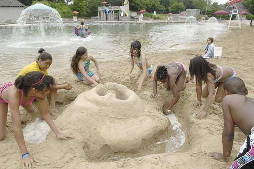Beach features and amenities: Water play features, shallow end slide, zero-depth walk-in area, bathhouses with showers and coin lockers, three diving boards, playground equipment, Frisbee area, life jackets available free. Inner tubes and inflatable devices prohibited.