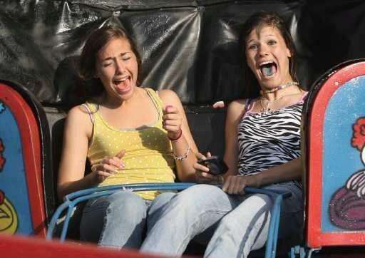 Kenzie Verheyen and Jackie Janssen ride the tilt-a-whirl during BeachFest at the Round Lake Beach Cultural and Civic Center. Daily Herald file photo