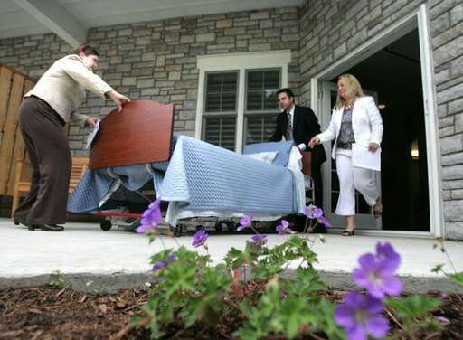 Victoria Shaw, senior development officer, left, Frank Cascella, account specialist, and Charlotte Grahovac, account specialist, all with Pepper Family Hospice and Palliative Care of Northeastern Illinois, demonstrate how the beds in the rooms roll directly outside to the courtyard of the facility. George LeClaire | Staff Photographer