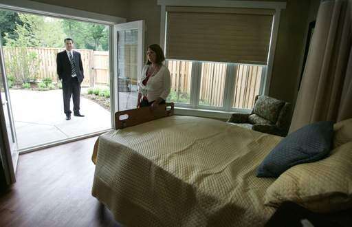 Eileen Grace, right, chief nursing officer, and Frank Cascella, account specialist, Pepper Family Hospice and Palliative Care of Northeastern Illinois, explain how the beds in the rooms roll directly outside to the courtyard of the facility in Barrington. George LeClaire | Staff Photographer